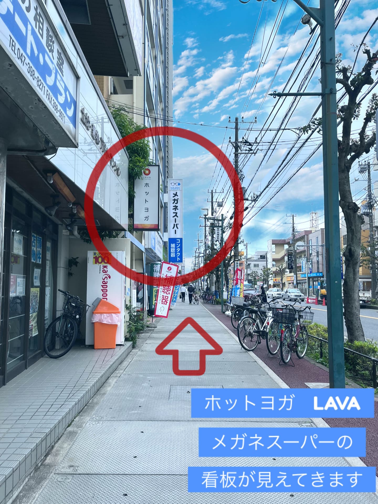 4. 100m程直進すると信号があります。信号を渡り、直進するとホットヨガLAVA・メガネスーパーが見えます。