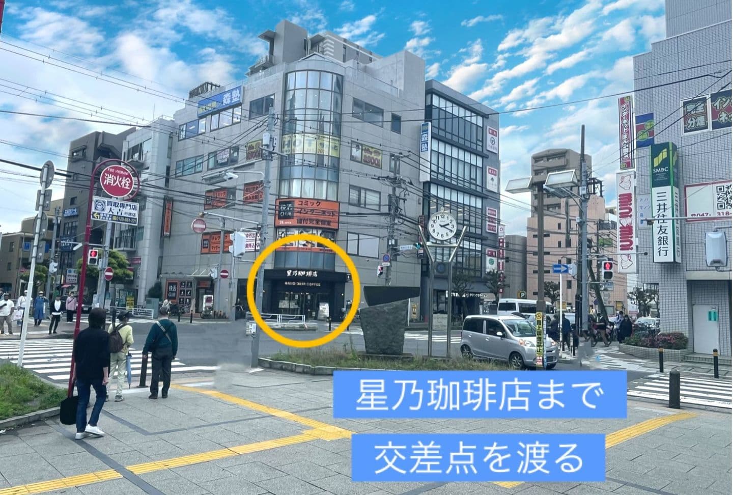 2. 南口広場に出ると交差点があります。交差点を2回渡り、向かいにある星乃珈琲店まで進みます。
