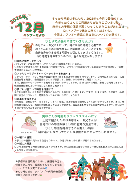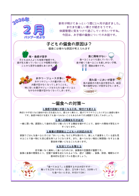 2026.2.2 new!子どもの偏食 2026.1.7 お薬について 2025.12.1 ワンオペ育児の息抜きについて 2025.11.4クループ症候群 2025.10.6おもちゃ紹介④ 2025.10.1 癇癪について 2025.9.5 おもちゃ紹介③ 2025.9.1 防災週間 2025.8.15おもちゃ紹介② 2025.8.4トイレトレーニング 2025.7.1夏に多い感染症について 2025.6.2叱り方について 2025.5.26 ひきつけとは 2025.4.28 人見知り 2025.3.31 水ぼうそうとおたふく 2025.2.27 言葉の発達 2025.1.27 スキンケア 2024.12.16 冬の感染症 2024.12.2 片付け 2024.11.18 マイコプラズマ 2024.11.5 抱っこ 2024.10.15インフルエンザワクチン 2024.10.2 手作りおもちゃ② 2024.9.17 手作りおもちゃ 2024.9.2 防災週間 2024.8.19 熱中症② 2024.8.5 寝かしつけ 2024.7.26 熱中症 2024.7.8 絵本紹介② 2024.6.24 ヒトメタニューモウイルス 2024.6.10 おもちゃ紹介① 2024.5.29 溶連菌感染症 2024.5.13 絵本紹介 2024.4.24 胃腸炎 2024.4.12 お散歩 2024.3.28インフルエンザ 2024.3.18昼食・おやつ紹介 2026.2.2new!子どもの偏食 2026.1.7お薬について 2025.12.1ワンオペ育児の息抜きについて 2025.11.4クループ症候群 2025.10.6おもちゃ紹介④ 2025.10.1癇癪について 2025.9.5 おもちゃ紹介③ 2025.9.1 防災週間 2025.8.15おもちゃ紹介② 2025.8.4 トイレトレーニング 2025.7.1 夏に多い感染症について 2025.6.2 叱り方について 2025.5.26 ひきつけとは 2025.4.28 人見知り 2025.3.31 水ぼうそうとおたふく 2025.2.27 言葉の発達 2025.1.27 スキンケア 2024.12.16 冬の感染症 2024.12.2 片付け 2024.11.18 マイコプラズマ 2024.11.5 抱っこ 2024.10.15 インフルエンザワクチン 2024.10.2 手作りおもちゃ② 2024.9.17 手作りおもちゃ 2024.9.2 防災週間 2024.8.19 熱中症② 2024.8.5 寝かしつけ 2024.7.26 熱中症 2024.7.8 絵本紹介② 2024.6.24 ヒトメタニューモウイルス 2024.6.10 おもちゃ紹介① 2024.5.29 溶連菌感染症 2024.5.12 絵本紹介 2024.4.24 胃腸炎 2024.4.12 お散歩 2024.3.28 インフルエンザ 2024.3.18 昼食・おやつ紹介